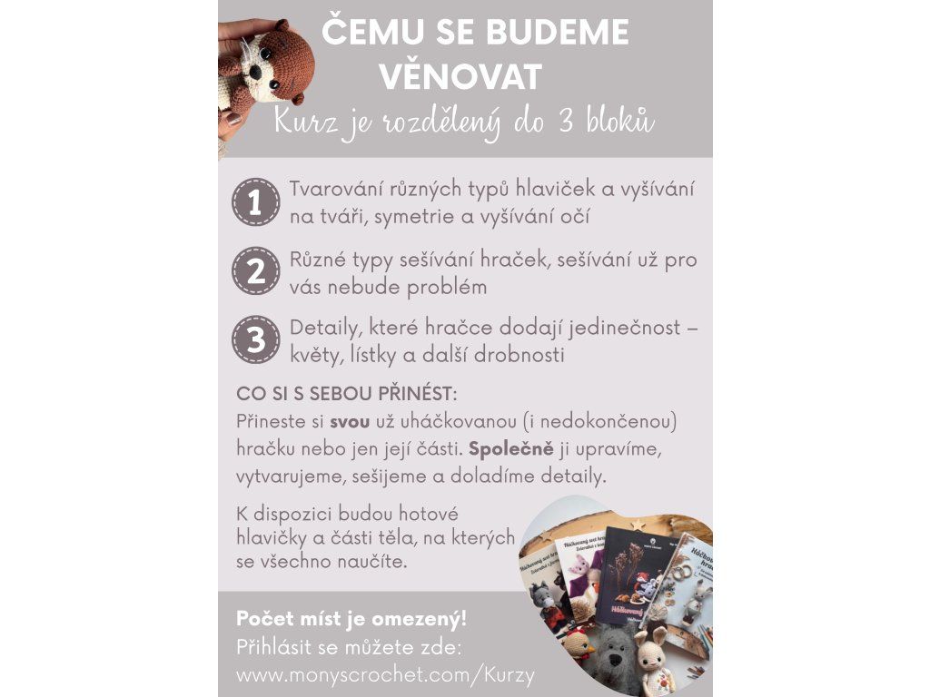 Kurz je rozdělen do 3 bloků a je koncipován jako praktický – budete pracovat přímo na své vlastní háčkované hračce (může být i nedokončená nebo jen části hračky).